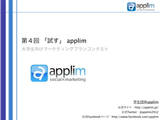 これまでのapplim... 第1回applim:ソーシャルアプリ×マーケティング 第2回applim:スマートフォン×マーケティング applim+ :商材指定×実装化(課題の発見と解決)