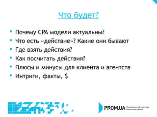 Документ обсуждает модели CPA (оплата за действие) в рекламе, объясняя, что оплата осуществляется только за целевые действия, а не за показы или клики. Описываются различные виды действий, их стоимость и риски, а также преимущества и недостатки для клиентов и исполнителей. Приводятся примеры успешного использования моделей CPA в различных тематиках, таких как финансовые и интернет-услуги.