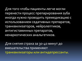 Документ описывает различные методы анестезии в ортопедической стоматологии, включая премедикацию, аппликационную, инфильтрационную и проводниковую анестезию. Уделяется внимание использованию различных анестетиков и комбинаций с сосудосуживающими средствами для улучшения эффекта. Также рассматриваются современные методы обезболивания, такие как аудиоанальгезия и иглорефлексотерапия.