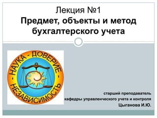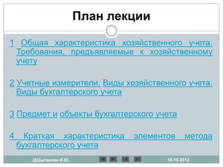 Лекция охватывает основные аспекты бухгалтерского учета, включая характеристики, требования и виды учета. Рассматриваются предмет и объекты бухгалтерского учета, а также элементы методологии учета, что помогает установить четкие критерии для ведения учета в организации. Также предлагаются источники литературы и вопросы для дальнейшего изучения темы.