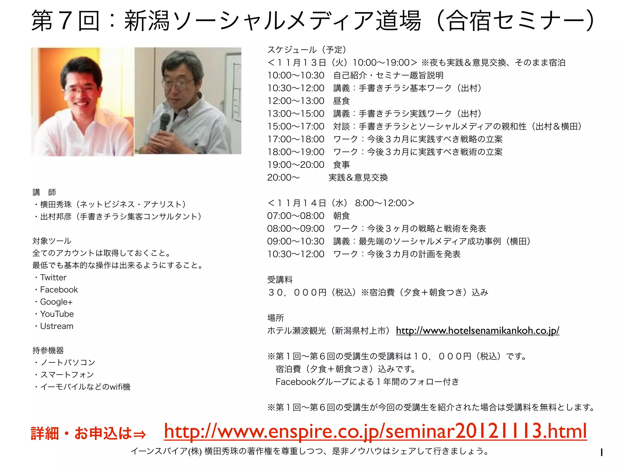 スケジュール(予定) <11月13日(火)10:00∼19:00> ※夜も実践&意見交換、そのまま宿泊 10:00∼10:30 自己紹介・セミナー趣旨説明 10:30∼12:00 講義:手書きチラシ基本ワーク(出村) 12:00∼13:00 昼食 13:00∼15:00 講義:手書きチラシ実践ワーク(出村) 15:00∼17:00 対談:手書きチラシとソーシャルメディアの親和性(出村&横田) 17:00∼18:00 ワーク:今後3カ月に実践すべき戦略の立案 18:00∼19:00 ワーク:今後3カ月に実践すべき戦術の立案 19:00∼20:00 食事 20:00∼ 実践&意見交換 講 師 ・横田秀珠(ネットビジネス・アナリスト) <11月14日(水) 8:00∼12:00> ・出村邦彦(手書きチラシ集客コンサルタント) 07:00∼08:00 朝食 08:00∼09:00 ワーク:今後3ヶ月の戦略と戦術を発表 対象ツール 09:00∼10:30 講義:最先端のソーシャルメディア成功事例(横田) 全てのアカウントは取得しておくこと。 10:30∼12:00 ワーク:今後3カ月の計画を発表 最低でも基本的な操作は出来るようにすること。 ・Twitter 受講料 ・Facebook 30,000円(税込)※宿泊費(夕食+朝食つき)込み ・Google+ ・YouTube 場所 ・Ustream ホテル瀬波観光(新潟県村上市) http://www.hotelsenamikankoh.co.jp/ 持参機器 ※第1回∼第6回の受講生の受講料は10,000円(税込)です。 ・ノートパソコン 宿泊費(夕食+朝食つき)込みです。 ・スマートフォン Facebookグループによる1年間のフォロー付き ・イーモバイルなどのwifi機 ※第1回∼第6回の受講生が今回の受講生を紹介された場合は受講料を無料とします。 詳細・お申込は http://www.enspire.co.jp/seminar20121113.html イーンスパイア(株) 横田秀珠の著作権を尊重しつつ、是非ノウハウはシェアして行きましょう。 1