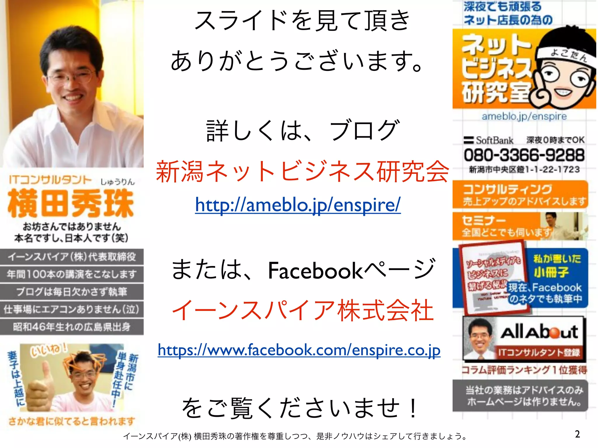 ありがとうございます。 詳しくは、ブログ 新潟ネットビジネス研究会 http://ameblo.jp/enspire/ または、Facebookページ イーンスパイア株式会社 https://www.facebook.com/enspire.co.jp をご覧くださいませ! イーンスパイア(株) 横田秀珠の著作権を尊重しつつ、是非ノウハウはシェアして行きましょう。 2