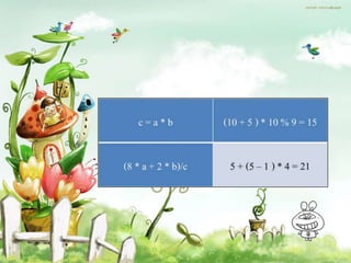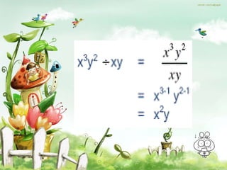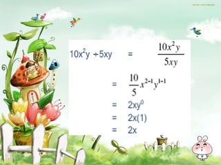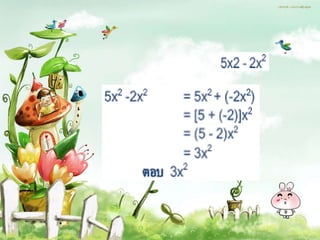 This document contains examples of algebraic expressions and equations. It shows how to combine like terms, factor expressions, and solve simple equations. For example, it shows that (x + 2)(x + 3) can be factored as x^2 + 5x + 6. It also provides step-by-step workings for subtracting expressions like 2y - (-5y) = 2y + 5y = 7y.