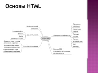 Документ представляет собой учебный материал по основам HTML, охватывающий синтаксис тегов, создание параграфов, списков, таблиц и ссылок. Также обсуждаются способы применения CSS для оформления веб-страниц и примеры кода для различных элементов. В заключение содержатся ссылки на ресурсы и контактная информация для обратной связи.