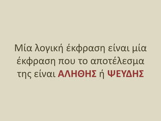 Μία παρουσίαση για το μάθημα "Ανάπτυξη Εφαρμογών σε Προγραμματιστικό Περιβάλλον" που αναφέρεται στην έννοια των λογικών εκφράσεων..