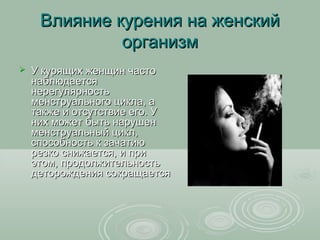 Документ описывает влияние курения на репродуктивное здоровье мужчин и женщин, подчеркивая его отрицательное воздействие на менструальный цикл, фертильность и внутриутробное развитие плода. Также рассматриваются проблемы курения у подростков, включая зависимость и риск хронических заболеваний. В качестве вывода подчеркивается необходимость отказа от курения для сохранения репродуктивного здоровья.