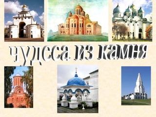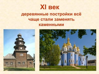 Документ описывает эволюцию архитектуры в России в XI-XVI веках, акцентируя внимание на переходе от деревянных к каменным постройкам. Упоминаются значимые храмы и соборы, такие как Софийский собор в Киеве и Успенский собор в Москве. Также указываются годы строительства и важные архитектурные особенности этих зданий.