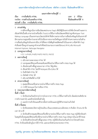30242 ชั้นมัธยมศึกษาปีที่ 4-6 แผนการจัดการเรียนรู้ที่ 1 เรื่อง การเริ่มต้นกับ HTML เวลา 2 ชั่วโมง รายวิชา การสร้างเว็บเพจด้วย HTML ชั้นมัธยมศึกษาปีที่ 4 หน่วยที่ 1 เรื่อง การเริ่มต้นกับ HTML 1 สาระสาคัญ การศึกษาพื้นฐานในการเขียนโฮมเพจ(Home Page) เพื่อให้ผู้เรียนทราบถึงที่มาโครงสร้างและการ เขียนคาสั่งเบื้องต้น สามารถนาเครื่องมือ (Tools) มาใช้ในการเขียนโฮมเพจได้อย่างถูกต้องHyper Text Markup Language เป็นเอกสารแบบไฮเปอร์เท็กซ์ ซึ่งมีความสามารถในการเชื่อมโยงข้อมูลไปยังเอกสารที่ มีความสามารถสูงเหนือกว่าเอกสารทั่วไปเนื่องจากสามารถเปิดข้อมูลภายในได้ ส่วนความสามารถในด้าน การเชื่อมโยงข้อมูลไปยังเอกสารอื่นๆ ทาได้โดยการใส่สัญลักษณ์พิเศษเข้าไปในเอกสาร หรือคาสั่ง (Tag) คาสั่งเหล่านี้จะถูกอ่านและถูกทาตามคาสั่งโดยโปรแกรมบราวเซอร์(Brows) ต่างๆ เช่น Microsoft Internet Explorer, Netscape Navigator 2 มาตรฐานการเรียนรู้ ง 3.1 ม 4-6/6, 4-6/8, 4-6/9, 4-6/11, 4-6/12 3 ผลการเรียนรู้ 1. อธิบายความหมายของ HTML ได้ 2. บอกคุณสมบัติของเครื่องคอมพิวเตอร์ที่จะนามาใช้ในการสร้าง Web Page ได้ 3. เขียนโครงสร้างพื้นฐานของภาษา HTML ได้ถกต้อง ู 4. เขียนคาสั่ง HTML โดยใช้ Notepad เป็น Editor ได้ 5. บันทึกไฟล์ HTML ได้ 6. เปิดไฟล์ HTML ได้ 7. อธิบายคาศัพท์ได้ 6 คาได้ 4 สาระการเรียนรู้ 1. คุณสมบัติของเครื่องสามารถนามาใช้ในการสร้าง Web Page 2. การใช้ Notepad ในการเขียน HTML 5 กระบวนการจัดการเรียนรู้ ขั้นที่ 1 ขั้นนา 1. นักเรียนร่วมกันอภิปรายว่าการนาเอาภาษา HTML มาใช้ในการสร้างเว็บ มีผลต่อประสิทธิภาพ การทางานอย่างไร และมีประโยชน์ในด้านใด 2. แนะนาการเข้าเรียนและศึกษาเนื้อหาบทเรียนและปฏิบัติกิจกรรมผ่านเว็บไซต์ ขั้นที่ 2 ขั้นสอน 1. นักเรียนทดสอบวัดความรู้ก่อนเรียน เป็นแบบทดสอบแบบเลือกตอบ 4 ตัวเลือก จานวน 40 ข้อ เวลา 40 นาที 2. นักเรียนศึกษาคุณสมบัติของเครื่องที่สามารถนามาใช้ในการสร้าง Web Page ครูให้นักเรียนทา ในสมุดถึงเรื่องคุณสมบัติของเครื่องที่สามารถนามาใช้ในการสร้าง Web Page ส่งครูภายในเวลาที่กาหนด 3. นักเรียนศึกษาโครงสร้างพื้นฐานของ HTML ครูให้นักเรียนร่วมกันอภิปรายว่าโครงสร้างของ HTML จาเป็นจะต้องมีกฎในการใช้ HTML และบอกถึงส่วนประกอบของ HTML ครูเทวัญ ภูพานทอง ครู โรงเรียนนามนพิทยาคม สพม.24 http://comkrutae.wordpress.com
