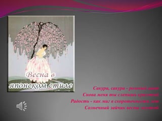 Документ содержит описание сакуры и её красоты, ассоциируемой с весной. Он передаёт радость и мимолётность жизни. В тексте акцентируется внимание на зрительных и эмоциональных ощущениях от цветения сакуры.