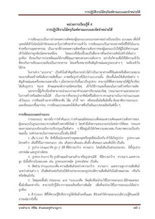 หน่วยการเรียนรู้ที่ 4 การปฏิบัติงานไม้ครุภัณฑ์ตามแบบและจัดจาหน่ายได้ การเขียนแบบเป็นการถ่ายทอดความคิดของผู้ออกแบบลงบนกระดาษอย่างเป็นระเบียบ แบบแผน เพื่อให้ บุคคลได้เข้าใจโดยไม่จากัดระยะเวลาในการศึกษาทาความเข้าใจ การเขียนแบบเป็นภาษาอย่างหนึ่งที่ใช้กันในงาน ช่างหรืองานอุตสาหกรรม เป็นภาษาที่ถ่ายทอดความคิดหรือความต้องการของผู้ออกแบบไปให้ผู้อื่นได้ทราบและ เข้าใจได้อย่างถูกต้องไม่คลาดเคลื่อน โดยแบบที่เขียนขึ้นจะเป็นสื่อกลางที่จะนาความคิดไปสร้างได้อย่าง ถูกต้อง อันจะเป็นการประหยัดและได้งานที่มีคุณภาพตรงตามความต้องการ อย่างไรก็ตามเพื่อให้ได้ความเข้าใจ ที่ตรงกันการเขียนแบบจะต้องเป็นภาษาสากล โดยเครื่องหมายหรือสัญลักษณ์และรูปแบบต่าง ๆ จะต้องเข้าใจ ได้ง่าย ในงานช่าง “แบบงาน” เป็นหัวใจสาคัญหรืออาจกล่าวได้ว่าเป็นภาษาสากลที่ใช้แสดงหรือสื่อความหมาย ของงานที่จะสร้างหรือต้องการผลิตขึ้นมา ภาพหรือรูปร่างที่เรียกว่าแบบงานนั้น เขียนขึ้นโดยใช้เส้นชนิดต่าง ๆ สัญลักษณ์และเครื่องหมายเฉพาะอื่น ๆ เมื่อประกอบกันขึ้นมาเป็นรูปทรง สามารถใช้สื่อความหมายให้ผู้เกี่ยวข้อง ได้เห็ นรูปร่าง ขนาด ลักษณะของผิวงานชนิดของวัสดุ เข้าใจวิธีการและขั้นตอนในการสร้างหรือการผลิต นอกจากนี้ผู้เกี่ยวข้องยังสามารถนาแบบงานมาคานวณหาปริมาณของวัสดุ ประมาณราคาและระยะเวลา ในการสร้างหรือผลิตงานนั้นได้ เป็นการยากที่จะระบุว่าอาชีพใดที่ไม่ต้องการ ความสามารถในการอ่านแบบและ เข้าใจแบบ การที่จะสร้างอาคารที่พักอาศัย โต๊ะ เก้าอี้ ฯลฯ หรือของอื่นใดที่ผลิตขึ้น ต้องอาศัยการออกแบบ และเขียนแบบขึ้นมาก่อน การเขียนแบบจะแสดงให้เห็นภาพซึ่งเป็นต้นแบบของผลิตภัณฑ์นั้น ๆ การเขียนแบบและอ่านแบบ การออกแบบ หมายถึง การทาต้นแบบ การทาแผนผังของแบบเพื่อสนองความคิดและความต้องการของ ผู้ออกแบบในรูปแบบของ ความคิดสร้างสรรค์สิ่งใหม่ ๆ โดยคานึงถึงความสวยงามประโยชน์การใช้สอย ประเภท ของการออกแบบยังรวมถึงการปรับปรุงแก้ไขสิ่งต่าง ๆ ที่มีอยู่แล้วให้เกิดความเหมาะสม กับสภาพความเป็นจริง ขณะนั้น องค์ประกอบในการออกแบบเบื้องต้น มีดังนี้ 1. เส้น (Line) คือ สิ่งที่เชื่อมโยงระหว่างจุดสองจุดหรือจุดที่ต่อเนื่องกัน ทาให้เกิดรูปร่าง รูปทรง และ โครงสร้าง เส้นที่ใช้ในการออกแบบ เช่น เส้นตรง เส้นนอน เส้นตั้ง เส้นทแยง และเส้นโค้ง เป็นต้น 2. รูปร่าง (shape) คือ รูป 2 มิติ ที่มีความกว้าง ความยาว โดยมีเส้นเป็นส่วนประกอบ มีทั้งรูปร่าง เรขาคณิต และรูปร่างอิสระ 3. รูปทรง (F