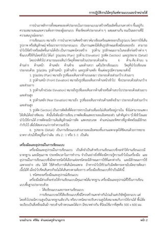 รูปที่ 4.1 โต๊ะเขียนแบบ 2. อุปกรณ์ที่ใช้ขีดเส้น อุปกรณ์ที่ใช้ในการขีดเส้น ได้แก่ ไม้ที บรรทัดสามเหลี่ยม และบรรทัดสเกล - ไม้ที เป็นเครื่องมือที่สาคัญในการเขียนแบบ ไม้ที มีส่วนประกอบ 2 ส่วน คือส่วนหัวและส่วนใบ ทาจากไม้เนื้อแข็ง หรือ พลาสติกใส ทั้ง 2 ส่วน จะยึดตั้งฉากกัน ไม้ทใช้สาหรับขีดเส้นในแนวนอน และใช้ประกอบ ี กับฉากสามเหลี่ยม ขีดเส้นในแนวตั้งฉาก และขีดเส้นเอียงทามุมต่างๆ รูปที่ 4.2 ไม้ทีรูปที่ 4.3 บรรทัดสามเหลี่ยม - บรรทัดสามเหลี่ยม โดยทั่วไปทาจากพลาสติกใส เพื่อจะได้มองเห็นส่วนอื่นๆ ของแบบได้อย่าง ชัดเจน บรรทัดสามเหลี่ยมใช้สาหรับขีดเส้นดิ่งและเส้นเอนทามุมต่างๆ ปกติจะใช้คู่กับ ไม้ที มี 2 แบบ คือ แบบ ตายตัว ซึ่งมีค่ามุม 45-90-45 องศา กับค่ามุม 30-90-60 องศา และแบบปรับมุมต่างๆ ได้ - บรรทัดมาตราส่วน ใช้วัดขนาด มีความยาวต่างกัน ตั้งแต่ 150, 300, 400, และ 600 มิลลิเมตร มีมาตราส่วนต่างๆ เพื่อใช้เขียนรูปได้หลายขนาด คือ - มาตราส่วนขนาดเท่าของจริง 1 : 1 - มาตราส่วนย่อ 1 : 2, 1 : 5, 1 : 10, 1 : 100, 1 : 1000 เป็นต้น - มาตราส่วนขยาย 2 : 1, 5 : 1, 10 : 1, 100 : 1, 1000 : 1 เป็นต้น มาตราส่วนเท่าของจริง, มาตราส่วนย่อ, หรือมาตราส่านขยาย จะนาไปใช้งานในแต่ละประเภท ไม่เหมือนกัน ขึ้นอยู่กับลักษณะงาน 3. อุปกรณ์เขียนส่วนโค้ง อุปกรณ์ที่ใช้ในการเขียนส่วนโค้ง มีหลายแบบขึ้นอยู่กับลักษณะงานและการนาไปใช้ เช่น วงเวียน แบ่งออกเป็น 2 แบบ คือ วงเวียนที่ใช้เขียนส่วนโค้ง และวงเวียนที่ใช้ถ่ายขนาด เป็นต้น - วงเวียน เป็นอุปกรณ์สาหรับเขียนวงกลม หรือส่วนโค้ง ควรเลือกใช้ให้เหมาะสม นายอานาจ ศรีทิม ตาแหน่งครูชานาญการ หน้า 3