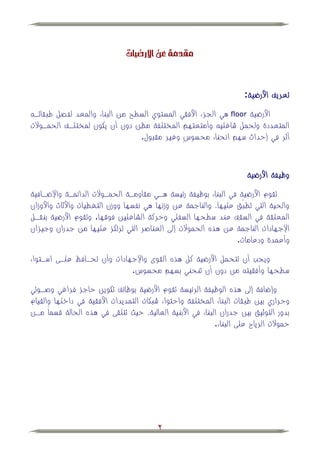 تناقش الوثيقة مفهوم الأرضيات، معرفتها، ووظائفها الأساسية مثل مقاومة الأحمال وتوزيع الإحمال. كما تتناول العوامل المؤثرة في اختيار المواد المستخدمة، مثل التكلفة والغرض من المنشأ والنظافة ومتطلبات الصيانة. بالإضافة إلى ذلك، تصف أنواع الأرضيات المختلفة وتكويناتها وإجراءات البناء المرتبطة بها.