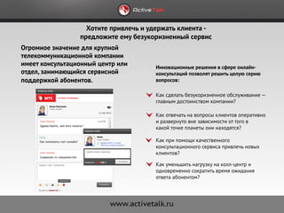 Документ описывает систему онлайн-консультаций activetalk, предназначенную для повышения качества обслуживания клиентов телекоммуникационных компаний. Она позволяет оперативно отвечать на запросы пользователей, контролировать работу операторов и проводить аналитику посещаемости сайта. Также упоминается интеграция с CRM и возможность совместного просмотра страниц (co-browsing), что улучшает взаимодействие между консультантами и клиентами.