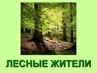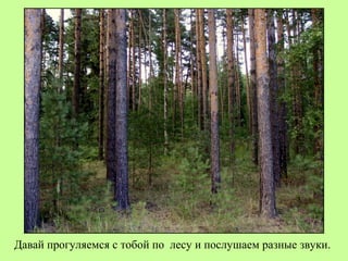 Документ описывает звуки и животных, обитающих в лесу, включая птиц, млекопитающих и насекомых. В нем упоминается множество видов, таких как кукушка, дятел, сова и медведь, а также их характерные звуки. Презентацию подготовила Татьяна Пироженко, текст читал Виктор Пироженко.