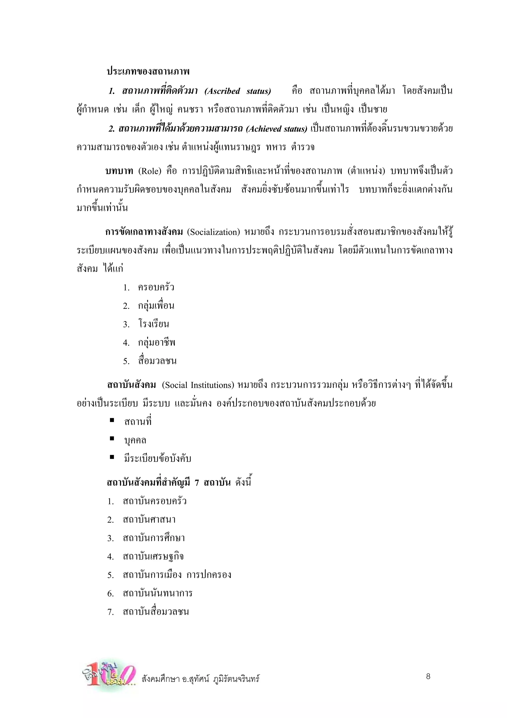 1. สถานภาพที่ติดตัวมา (Ascribed status) คือ สถานภาพที่บุคคลไดมา โดยสังคมเปน ผูกาหนด เชน เด็ก ผูใหญ คนชรา หรือสถานภาพที่ติดตัวมา เชน เปนหญิง เปนชาย ํ 2. สถานภาพทีไดมาดวยความสามารถ (Achieved status) เปนสถานภาพทีตองดินรนขวนขวายดวย ่ ่ ้ ความสามารถของตัวเอง เชน ตําแหนงผูแทนราษฎร ทหาร ตํารวจ บทบาท (Role) คือ การปฏิบัติตามสิทธิและหนาที่ของสถานภาพ (ตําแหนง) บทบาทจึงเปนตัว กําหนดความรับผิดชอบของบุคคลในสังคม สังคมยิ่งซับซอนมากขึ้นเทาไร บทบาทก็จะยิ่งแตกตางกัน มากขึ้นเทานั้น การขัดเกลาทางสังคม (Socialization) หมายถึง กระบวนการอบรมสั่งสอนสมาชิกของสังคมใหรู ระเบียบแผนของสังคม เพื่อเปนแนวทางในการประพฤติปฏิบัติในสังคม โดยมีตัวแทนในการขัดเกลาทาง สังคม ไดแก 1. ครอบครัว 2. กลุมเพื่อน 3. โรงเรียน 4. กลุมอาชีพ 5. สื่อมวลชน สถาบันสังคม (Social Institutions) หมายถึง กระบวนการรวมกลุม หรือวิธีการตางๆ ที่ไดจัดขึ้น อยางเปนระเบียบ มีระบบ และมั่นคง องคประกอบของสถาบันสังคมประกอบดวย สถานที่ บุคคล มีระเบียบขอบังคับ สถาบันสังคมที่สําคัญมี 7 สถาบัน ดังนี้ 1. สถาบันครอบครัว 2. สถาบันศาสนา 3. สถาบันการศึกษา 4. สถาบันเศรษฐกิจ 5. สถาบันการเมือง การปกครอง 6. สถาบันนันทนาการ 7. สถาบันสื่อมวลชน สังคมศึกษา อ.สุทัศน ภูมิรัตนจรินทร 8