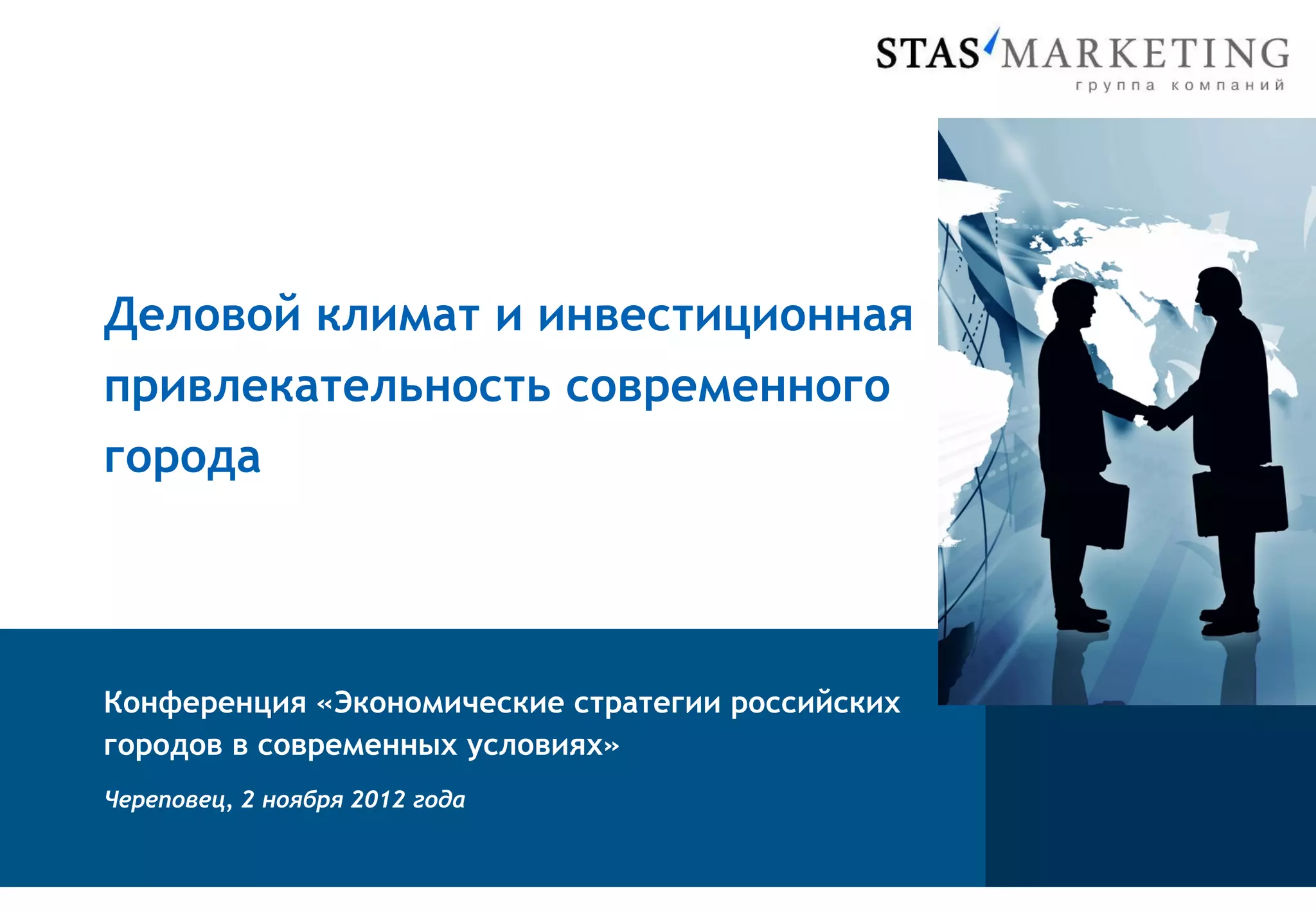 Документ описывает ключевые факторы, влияющие на инвестиционную привлекательность российских городов, включая экономический потенциал, инфраструктуру и квалификацию персонала. Он также подчеркивает важность гармоничного сотрудничества между инвесторами и получателями инвестиций для успешной инвестиционной политики. В конце представлена информация о компании Stas Marketing, являющейся лидером в области консалтинга и территориального маркетинга.