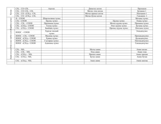 Документ представляет собой список углеводородов, включая алканы, алкены и алкины, с их химическими формулами и названиями. Он также включает информацию о производных углеводородов, таких как галогены, спирты, альдегиды и кислоты, с уточнением их структурной формулы. Кроме того, описываются амины и дихлористые соединения с данными о их структуре и названии.