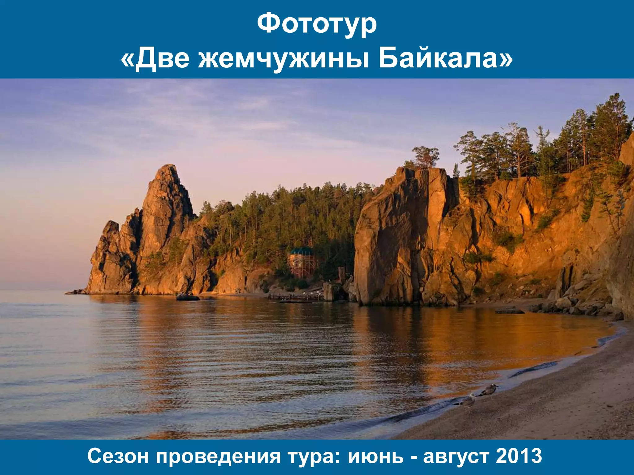 Документ представляет собой описание фототура 'Две жемчужины Байкала', который проходит с июня по август 2013 года и включает посещение живописных мест вокруг озера Байкал, таких как о. Ольхон и бухта Песчаная. Тур предлагает фотосъемки, экскурсии и отдых на природе, с предоставлением услуг проживания, питания и трансфера. Общая стоимость тура варьируется в зависимости от размещения, а также предоставляется гарантия качества туристических услуг.