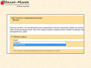 Документ содержит рекомендации по выбору доменного имени и продвижению сайтов в регионах России, с особым акцентом на домены второго и третьего уровня. Описаны преимущества и недостатки различных типов доменов, а также стратегии продвижения через Яндекс. Предоставлены примерные стоимости продвижения для разных городов и указаны дополнительные методы рекламы.