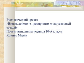Документ представляет экологический проект, выполненный ученицей 10-а класса, посвящённый взаимодействию промышленных предприятий с окружающей средой. Основные цели работы включают выявление влияния предприятий на экологию, разработку методов управления экологическими рисками и образование общества в области охраны окружающей среды. В проекте рассматриваются примеры экологических катастроф, современные технологии очистки и методы экономического воздействия на загрязнение.
