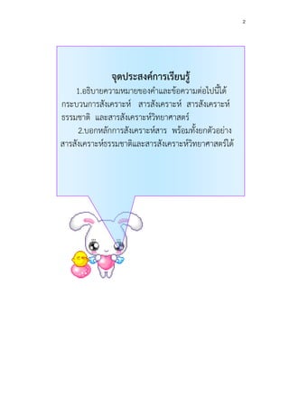 คาชี้แจงการใช้เอกสารประกอบการเรียน เอกสารประกอบการเรียนนีสร้างขึ้นเพื่อให้ผเรียนสามารถศึกษา หรือ ้ ู้ ทบทวนบทเรียนด้วยตนเอง เอกสารประกอบการเรียนจะเกิดประโยชน์สูงสุด ผู้เรียนควร ปฏิบัติตามคาชี้แจงต่อไปนี้อย่างเคร่งครัด 1. ให้ผู้เรียนอ่านจุดประสงค์อย่างละเอียดจะได้ทราบว่าเมื่อศึกษาเอกสาร ประกอบการเรียนเล่มนี้แล้วจะได้รับความรู้เรื่องใดบ้าง 2. ให้ผู้เรียนทาแบบทดสอบก่อนเรียน จานวน 5 ข้อ เพื่อวัดความรู้พื้นฐาน ของตนเอง 3. ให้ผู้เรียนศึกษารายละเอียดใบความรู้แต่ละตอนไปตามลาดับทีละหน้า 4. เมื่อศึกษาใบความรู้ในแต่ละตอนแล้ว ให้ผู้เรียนตอบคาถามทุกข้อในใบ งาน 5. เมื่อศึกษาใบความรู้และตอบคาถามในใบงานแล้ว ยังไม่เข้าใจตรงไหน ขอให้ผู้เรียนซักถามครู หรือกลับไปศึกษาอีกครั้ง 6. เมื่อศึกษาเอกสารประกอบการเรียนจบให้ทาแบบทดสอบหลังเรียน จานวน 5 ข้อ เพื่อดูความก้าวหน้า และวัดความเข้าใจของตนเอง 7. ให้ผู้เรียนตรวจคาตอบจากเฉลยท้ายเล่มด้วยความระมัดระวัง 8. ขอให้ผู้เรียนปฏิบัติกิจกรรมอย่างมีความสุข