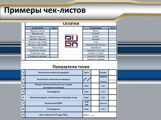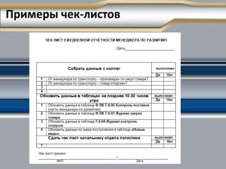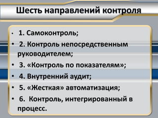Документ описывает методы контроля выполнения регламентов, включая самоконтроль, аудит, визуальный контроль со стороны руководителей и автоматизацию процессов. Подчеркивается важность знаний стандартов, внутренней мотивации и наличия инструментов для самоконтроля. Также рассматриваются роль автоматизированных систем в улучшении бизнес-процессов и необходимость подготовки сотрудников для эффективного управления процессами.