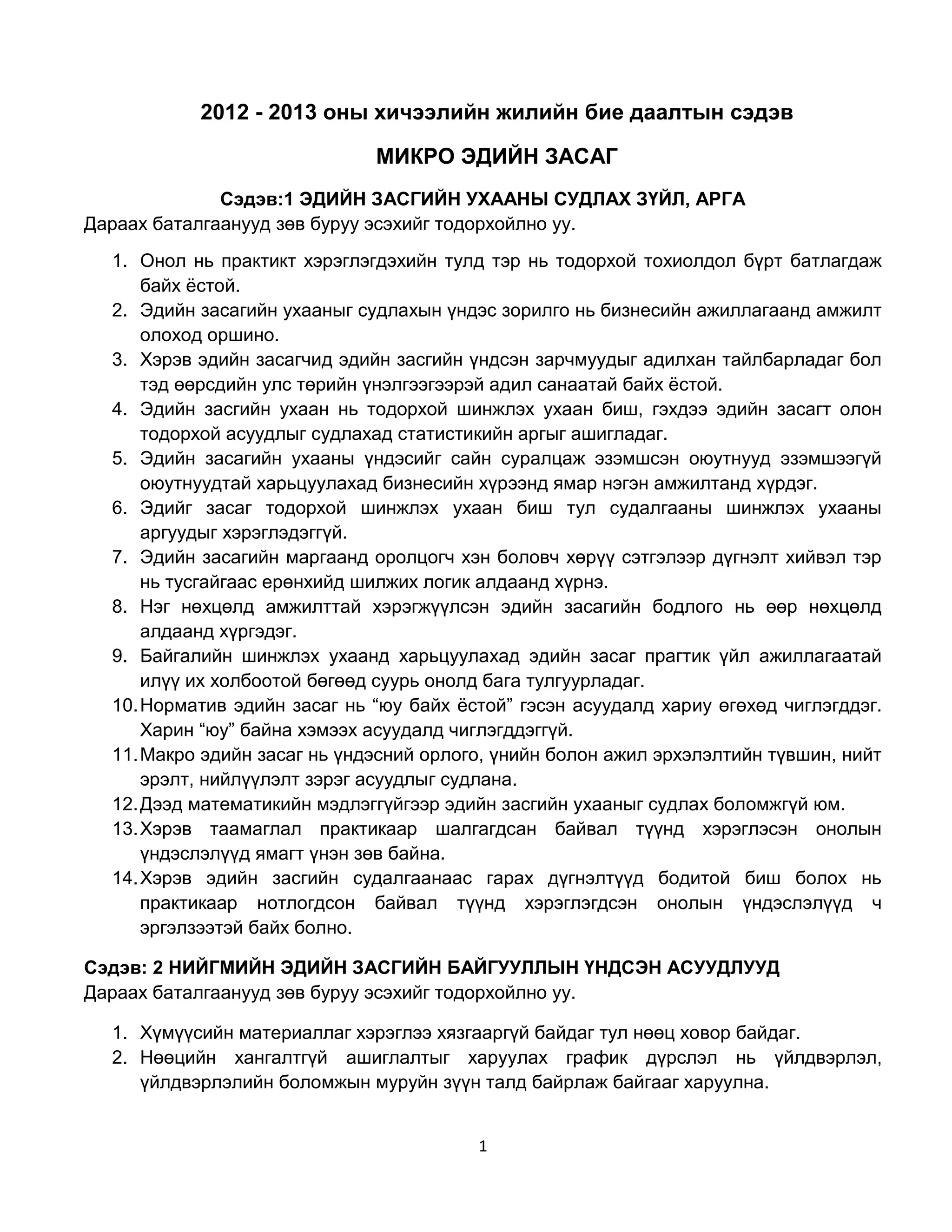микро эдийн засаг : судлах зүйл, судалгааны арга эзо бие даалтын сэдэв