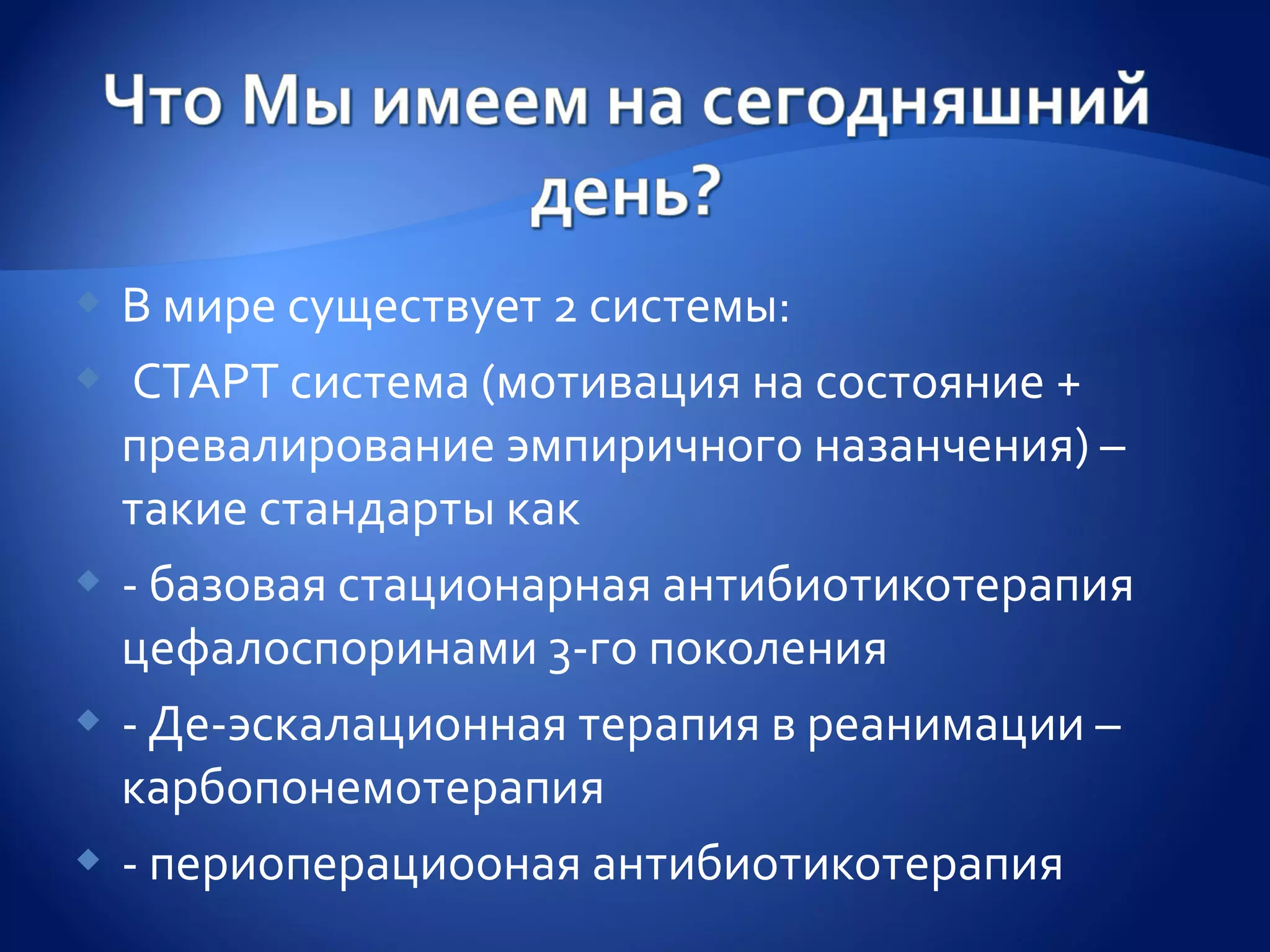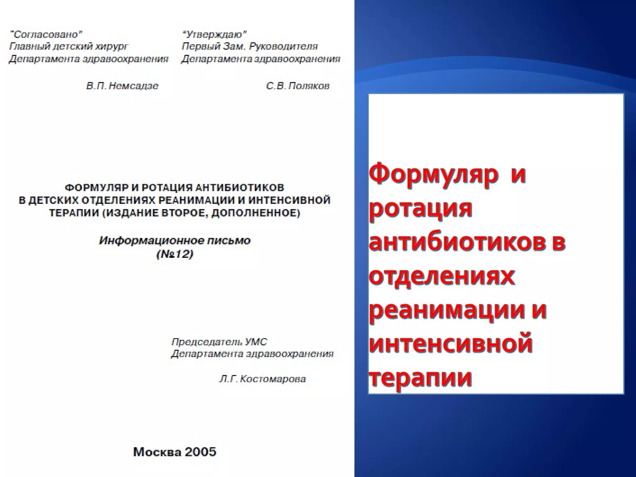 Документ обсуждает современные методы антибиотикотерапии, включая де-эскалацию, базовую стационарную терапию и профилактику инфекций. Он также рассматривает механизмы устойчивости бактерий, таких как энтерококки и псевдомонады, а также препараты, рекомендуемые для лечения. Результаты многочисленных исследований показывают развитие устойчивости к антибиотикам и необходимость обновления терапевтических протоколов.