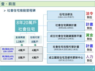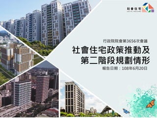 文档讨论了社会住宅政策的推动及第二阶段规划情况,目标在108年达到20万户的社会住宅,通过直接兴建和包租代管两种方式实现。在第一阶段的实施中,已完成27767户,达成率为69.4%。第二阶段计划在110-113年推进,但面临土地储备不足的问题,需加强中央与地方的合作。