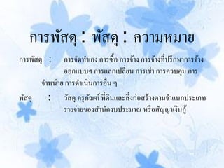 พัสดุ : วัสดุ ครุ ภณฑ์ ที่ดินและสิ่ งก่อสร้างตามจาแนกประเภท