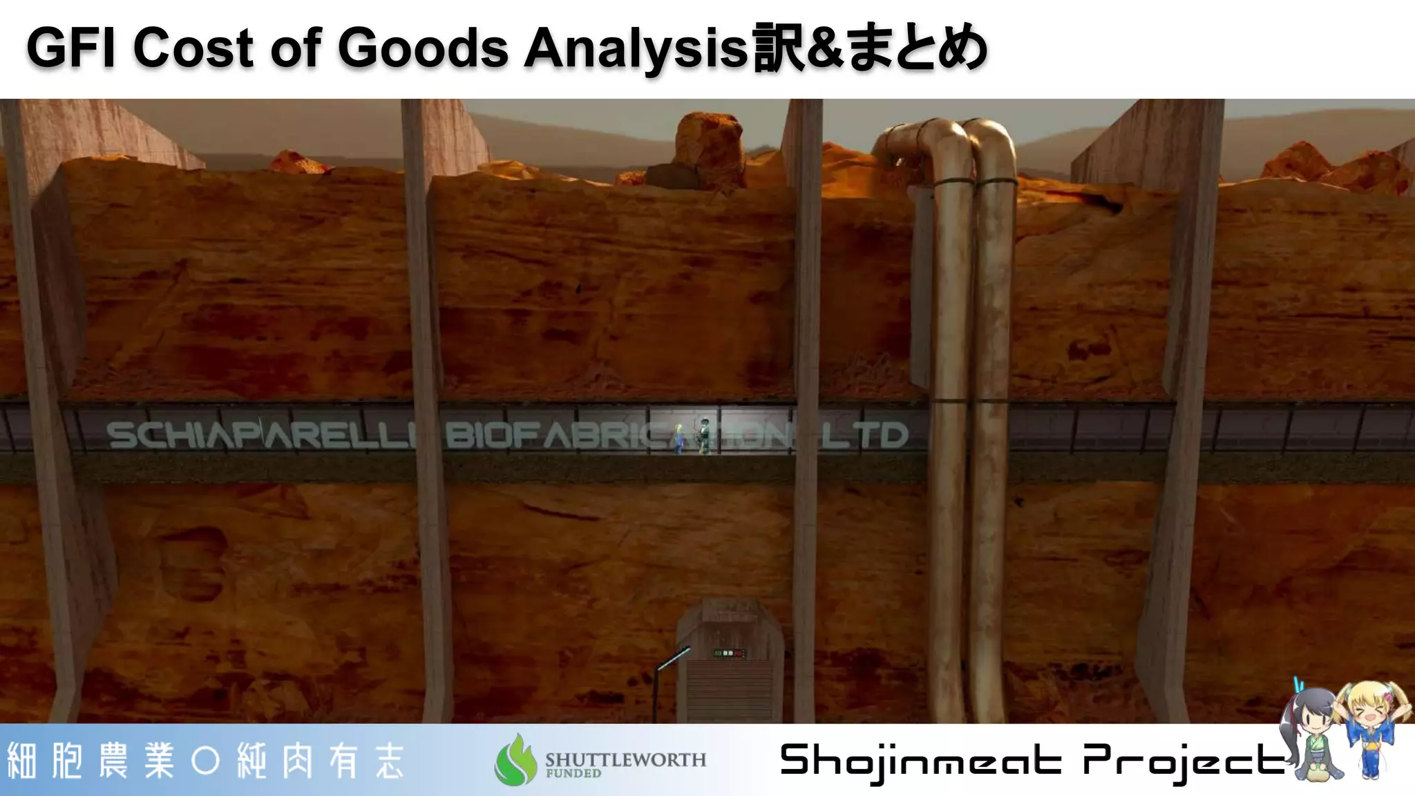 Goods Analysis GFIによる公開資料 ・全部入りバッチ方式を想定 ・糖分、ミネラル、成長因子などの 細胞肉の原料価格について調査 ・2016年版をアップデートした https://www.gfi.org/files/sci-tech/clean-mea t-production-volume-and-medium-cost.pdf