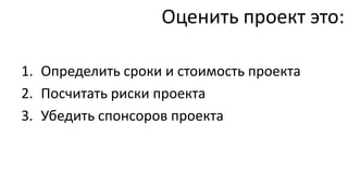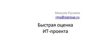 Документ описывает методику быстрой оценки ИТ-проектов, включая определение сроков, стоимости и рисков, а также использование статистики аналогичных завершённых проектов. Он акцентирует внимание на важности функционального размера программы и представлении трудозатрат через параметрическую модель, основанную на размере проекта. Также обсуждаются инструменты моделирования для оценки трудозатрат и эффективности работы команд.