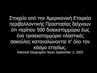 Στοιχεία από τηνΑμερικανική Εταιρεία περιβαλλοντικής Προστασίας δείχνουν ότι περίπου 500 δισεκατομμύρια έως ένα τρισεκατομμύριο πλαστικές σακούλες καταναλώνονται σ’ όλο τον κόσμο ετησίως. National Geographic News September 2, 2003