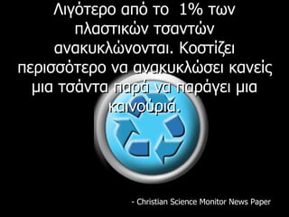 Λιγότερο από το 1% των πλαστικών τσαντών ανακυκλώνονται. Κοστίζει περισσότερο να ανακυκλώσει κανείς μια τσάντα παρά να παράγει μια καινούρια. - Christian Science Monitor News Paper