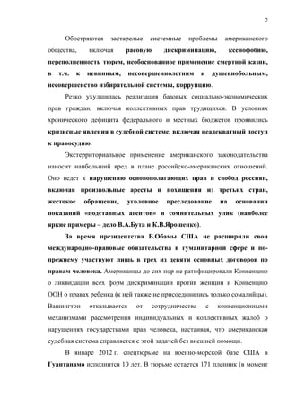 Доклад Министерства иностранных дел России освещает ситуацию с правами человека в США, подчеркивая нарушения, связанные с тюрьмой в Гуантанамо и использованием методов, квалифицированных как пытки. Несмотря на некоторые изменения, администрация Обамы продолжает практику бессрочного заключения и ограничения прав граждан, сохраняя многие аспекты контроля, введенные при Джордже Буше-младшем. Доклад также критикует действия американских властей в области свободы слова и прессы, указывая на проблемы с защитой журналистов и подавление информации.