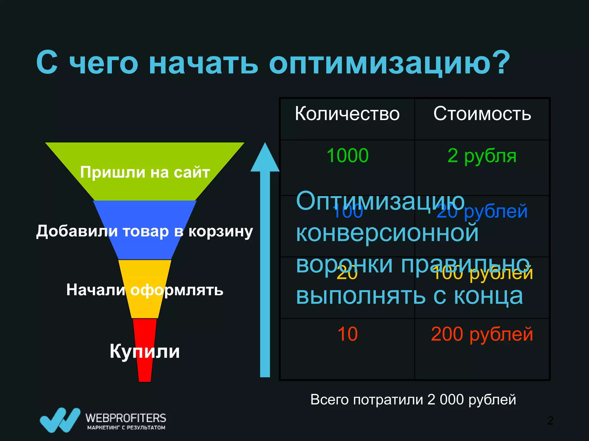 Документ описывает методологии оптимизации конверсии на сайте, включая выявление неэффективных страниц и источников трафика с помощью различных аналитических инструментов. Приведены примеры успешных оптимизаций, которые привели к увеличению продаж и сокращению показателей отказов. Также подчеркивается важность корреляции веб-аналитики с бизнес-целями компании.