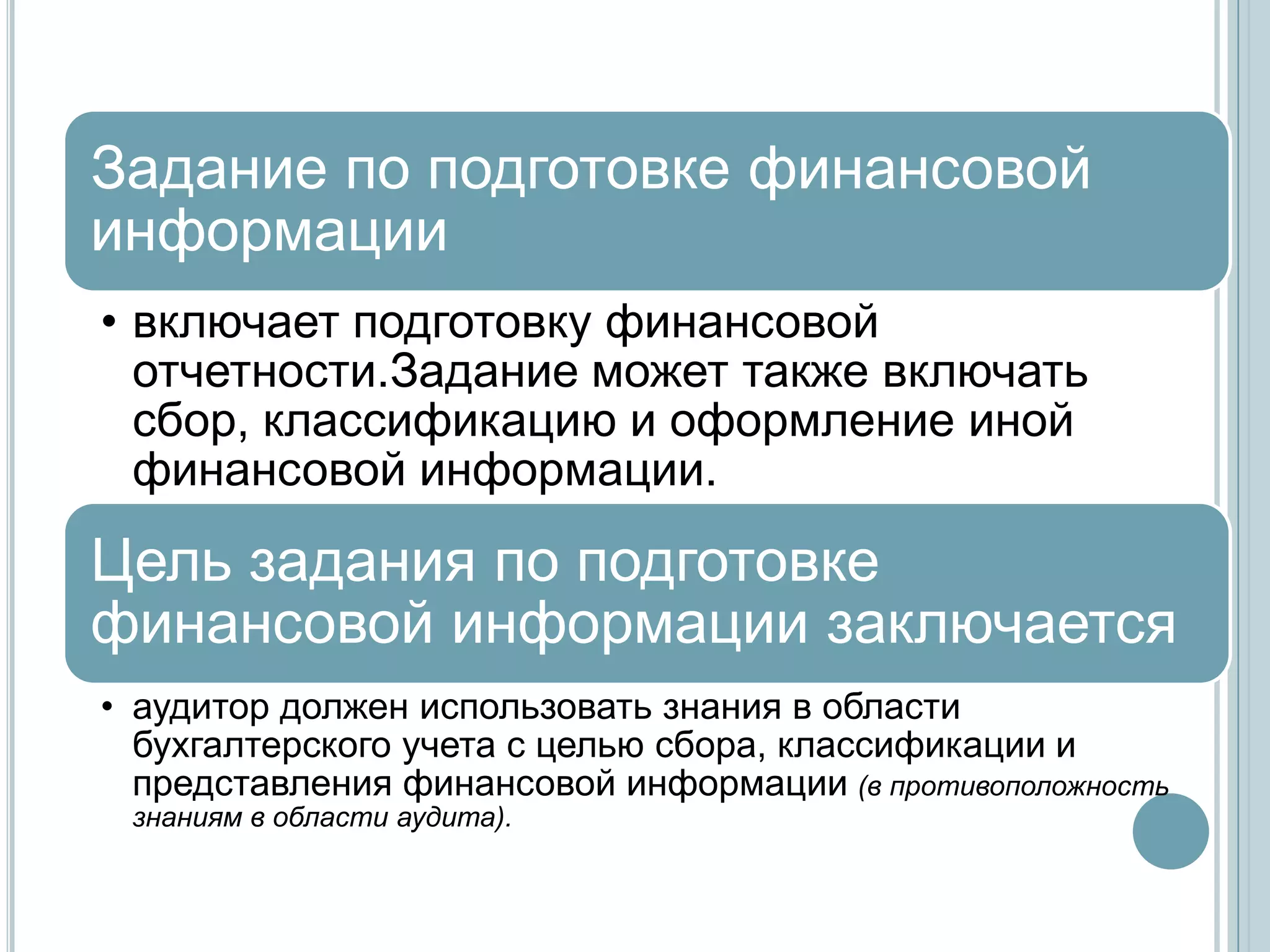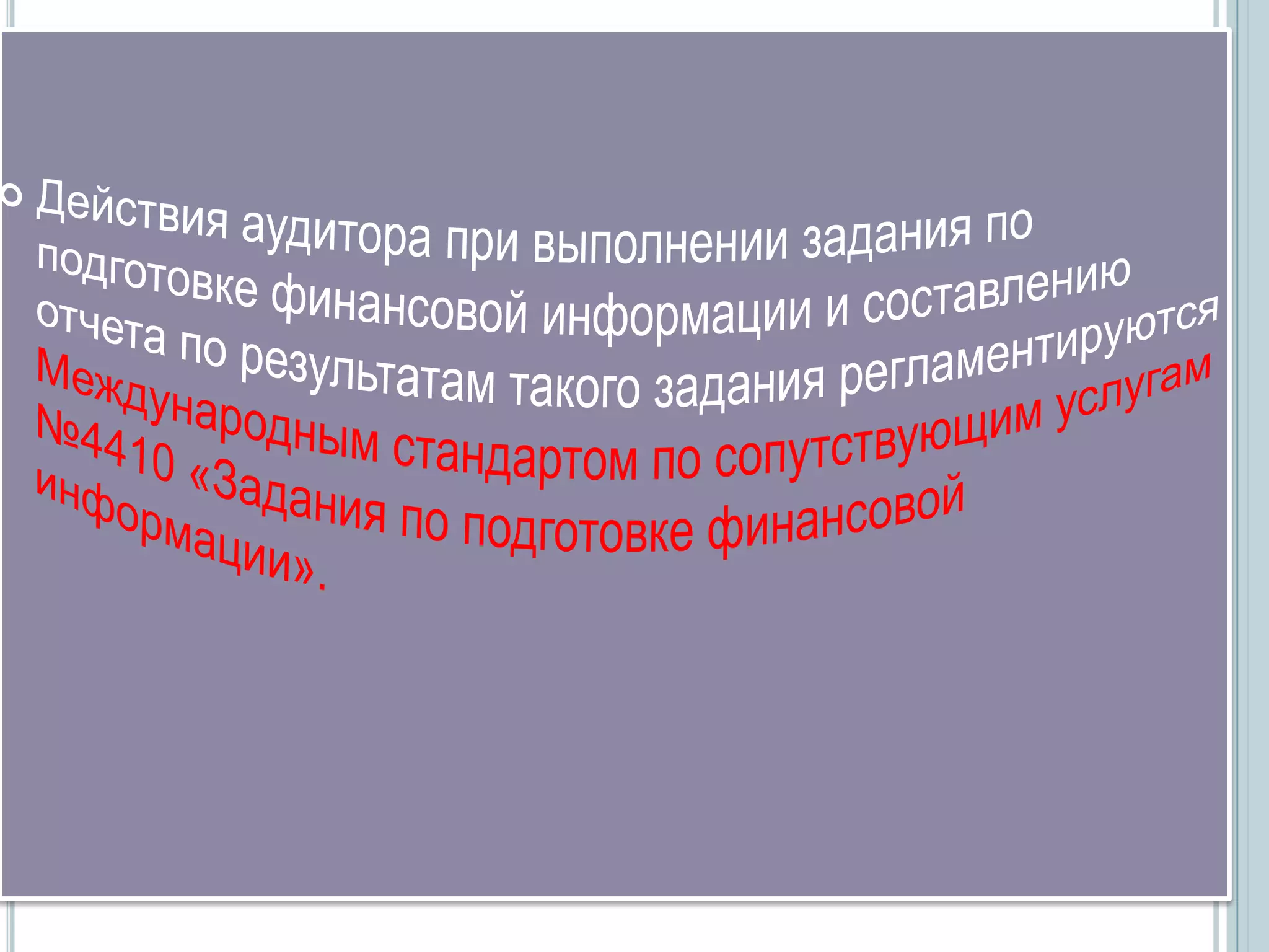 Документ описывает процесс подготовки финансовой информации, включая составление отчетности и сбор данных. Указаны этапы выполнения задания, от определения условий до составления отчета, а также важные аспекты, такие как ответственность клиента и отсутствие гарантии выявления ошибок. Также сравниваются международные стандарты с российскими.