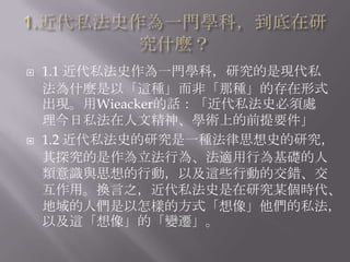 本文件探讨了近代私法史作为一门学科,强调法律思想与人类意识的历史交互,以及欧陆法律文化的演变历程。讨论了日耳曼法与罗马法之间的差异及其对法律专业化和社会治理的重要性,同时反思了法律继受的意义及其在东亚的应用。还提到了对2002年债法现代化的评价以及私人和公共法律之间的关系。