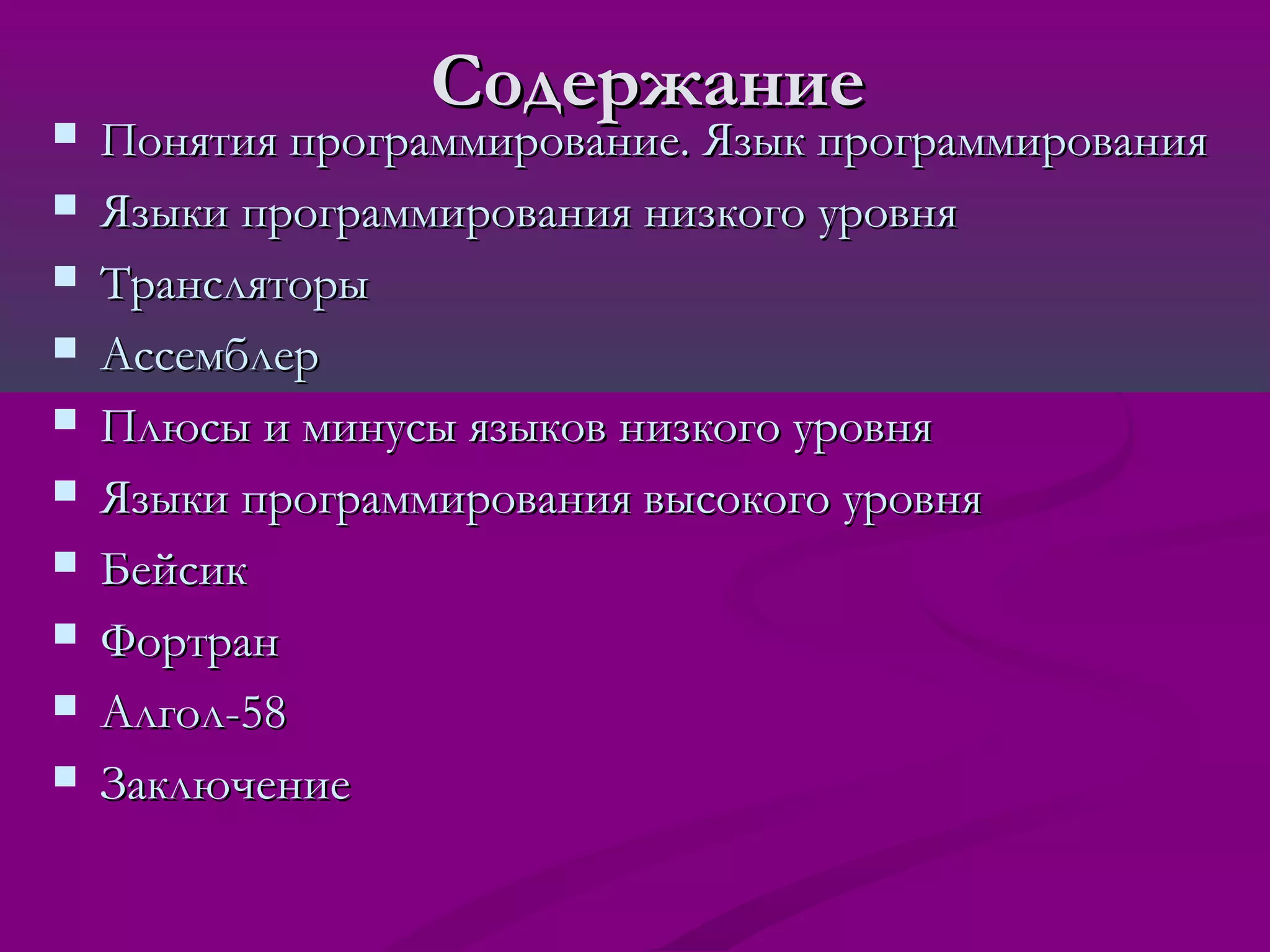 Презентация учащихся 10 а класса охватывает основные понятия программирования и языков программирования, включая низкий и высокий уровни. Рассматриваются характеристики языков низкого уровня и их сильные и слабые стороны, а также описание языков высокого уровня, таких как Фортран и Бейсик. В заключении подчеркивается, что существует более восьми тысяч языков программирования, которые продолжают развиваться и привлекать внимание профессиональных программистов.