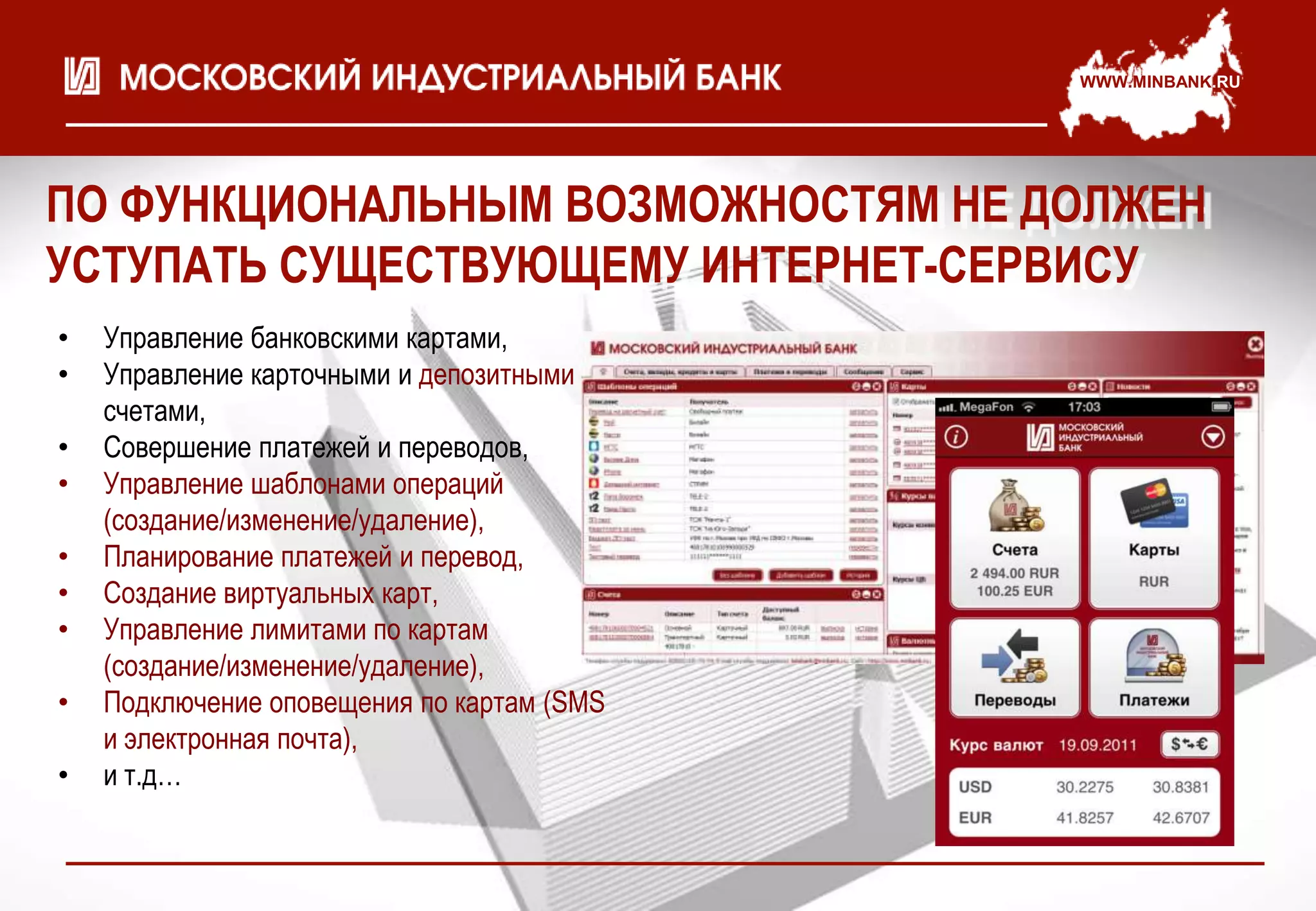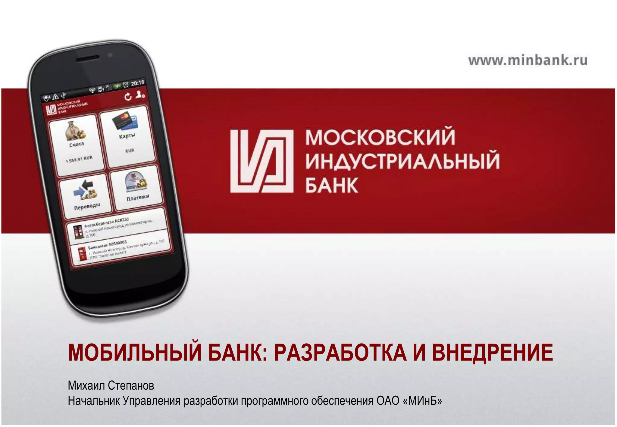 Документ описывает разработку и внедрение мобильного банка ОАО «Минб», который должен иметь функциональность, сопоставимую с существующим интернет-сервисом, включая управление картами, счетами и платежами. Также рассматриваются вопросы безопасности, включая использование шифрования SSL и аудит операций. Важно, чтобы сервис был доступен на большинстве современных мобильных устройств и использовал оптимизированные методы передачи данных для минимизации трафика.