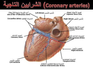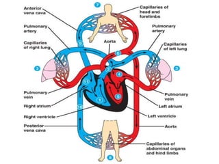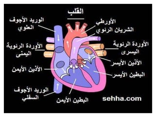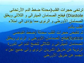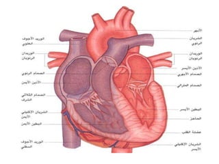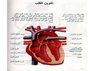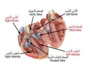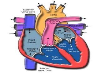 The document describes the structure and function of the human heart. It outlines the four chambers of the heart - right atrium, left atrium, right ventricle, and left ventricle. It notes the interatrial and interventricular septums that separate the chambers. Four valves are described - tricuspid, mitral, pulmonary, and aortic valves. The document explains that during diastole the heart fills with blood while during systole the ventricles contract to pump blood out of the heart.