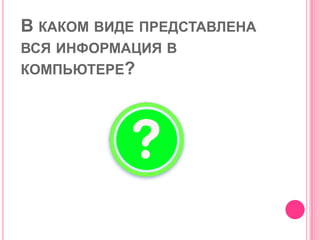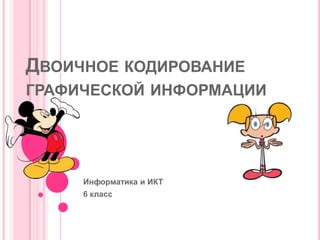 Документ посвящен двоичному кодированию графической информации, объясняя, что изображения можно разбивать на фрагменты и геометрические объекты. Рассматриваются два варианта кодирования: черно-белое и цветное изображение, а также различия между растровой и векторной графикой. В конце представлены задания для закрепления изученного материала.