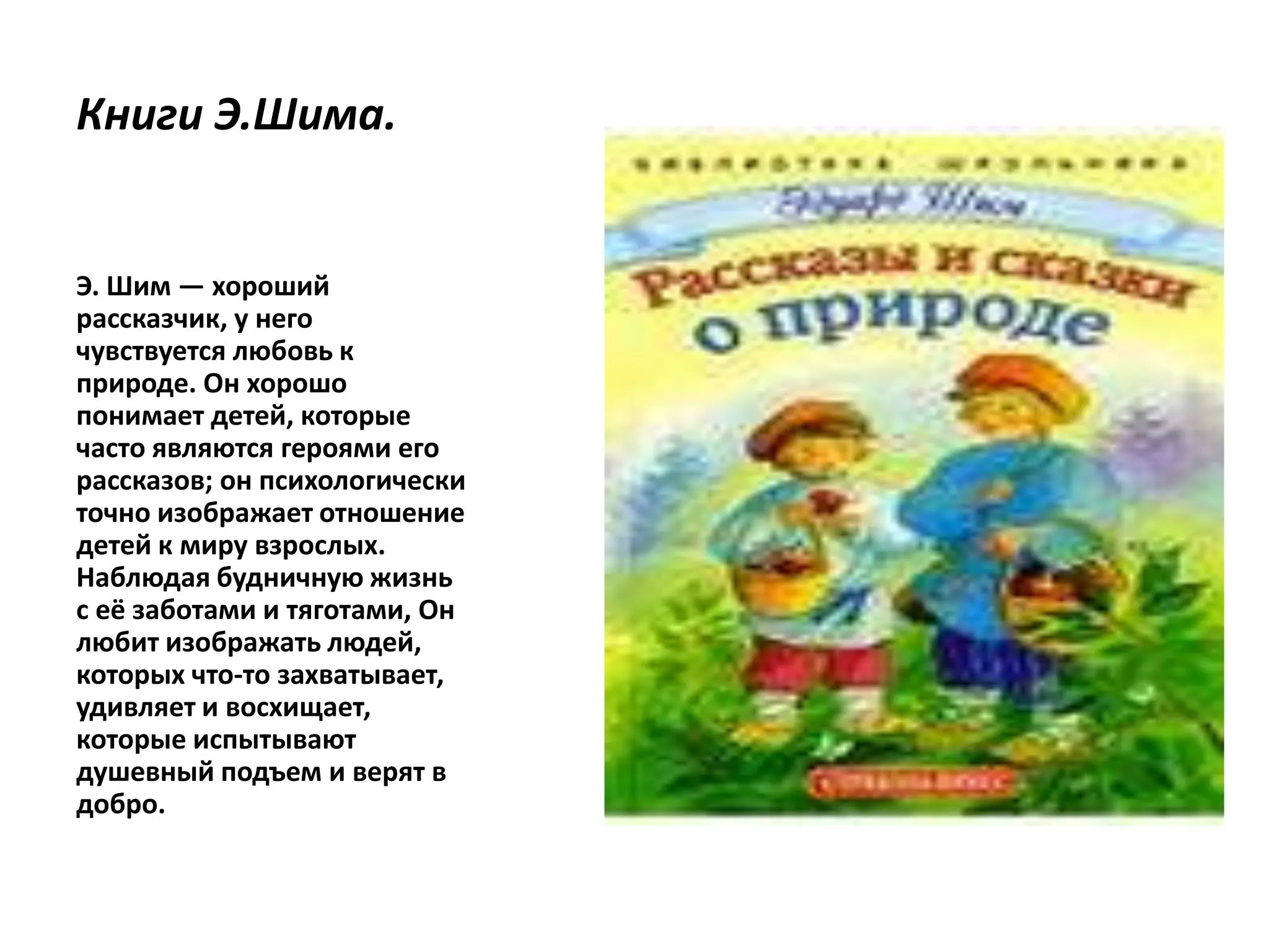 Эдуард Юрьевич Шим, родившийся в 1930 году в Ленинграде, пережил трудное детство и работал на различных занятиях. Он является талантливым рассказчиком, который с любовью описывает природу и точно изображает чувства детей в своих произведениях. В его книгах ощущается глубокая связь с будничной жизнью и философия добра.