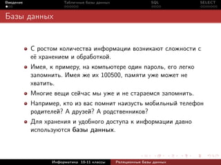 Документ представляет собой введение в реляционные базы данных и язык SQL для учеников 10-11 классов, описывая основные концепции, такие как типы баз данных, структура таблиц, и использование языка SQL для выполнения различных операций. Он включает примеры табличных баз данных и запросов, подчёркивая важность правильного выбора первичного ключа для уникальной идентификации записей. Основное внимание уделяется системе управления базами данных MySQL и её основным данным и функциям.
