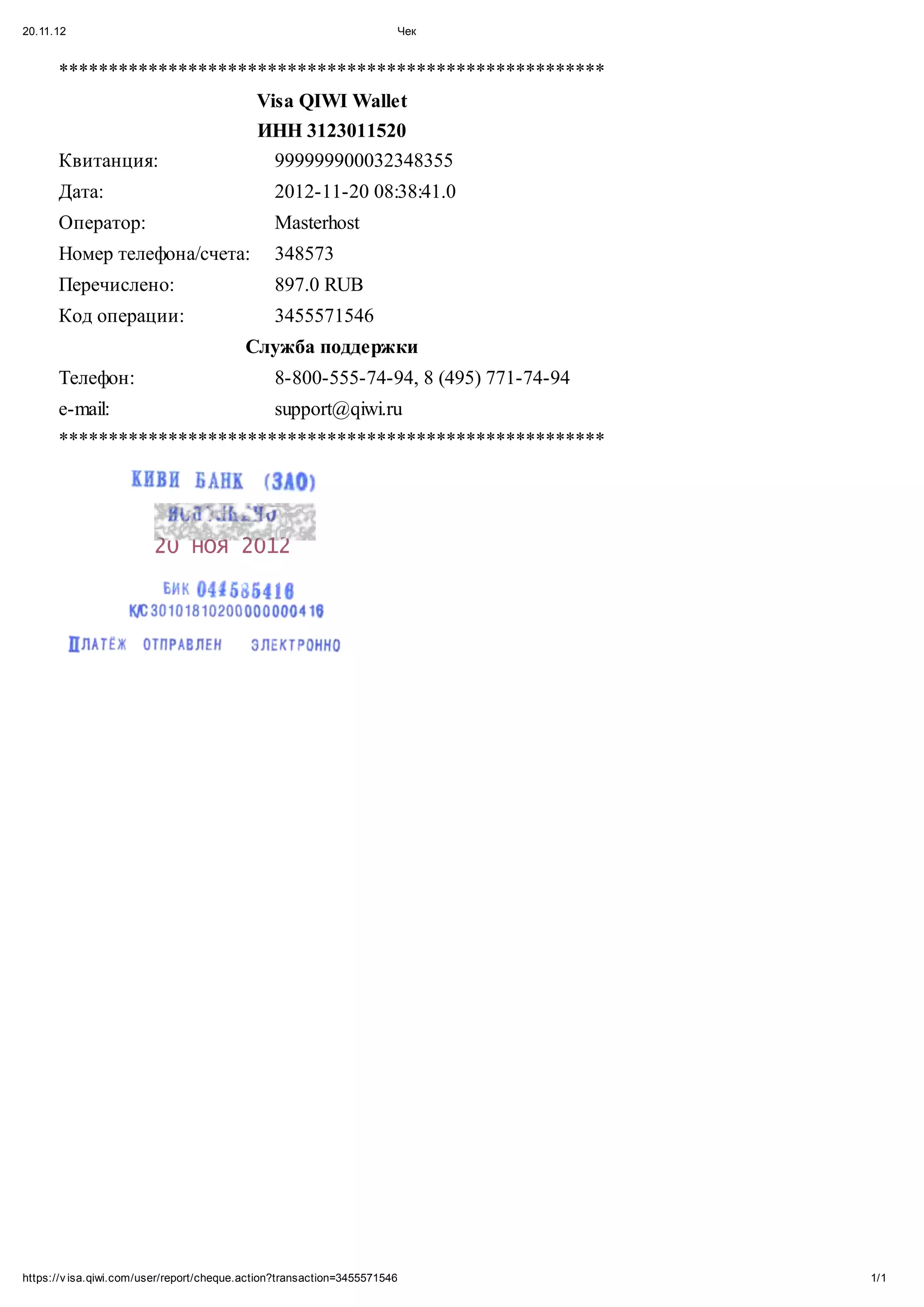 Документ представляет собой чек о транзакции в системе Visa QIWI Wallet, выполненной 20 ноября 2012 года. Указано, что было перечислено 897 рублей, а также предоставлена информация о контактах службы поддержки. Чек содержит детали операции, включая инн, код операции и ссылку для отчета.