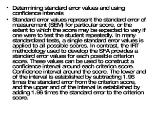 Standard error values represent the variability in a student's score if they were to take a test multiple times. The methodology used to develop the SFA provides a standard error value for each possible score. Confidence intervals can be constructed around each score by subtracting and adding 1.96 times the standard error from the criterion score. This provides a 95% confidence interval of a student's true score. The document provides examples of how to calculate confidence intervals for two students' scores.
