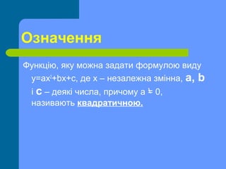 y=ax2+bx+c, де х – незалежна змінна, a, b