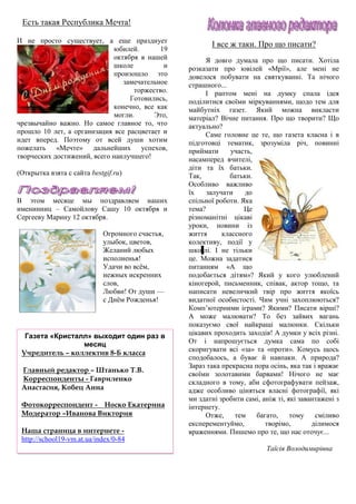 В октябрьском номере периодического издания 8-б класса обсуждаются знаковые события месяца, такие как Международный день музыки и День защиты животных, а также проводятся благотворительные мероприятия для помощи бездомным животным. Кроме того, редакция делится планами на будущее и приглашает учеников участвовать в различных творческих проектах. Номер подчеркивает важность музыки и искусства в жизни каждого человека.
