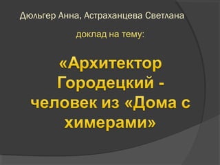 Документ описывает 'Дом с химерами' в Киеве, созданный архитектором Владиславом Городецким, известным представителем модерна. Городецкий выполнил множество архитектурных проектов в Киеве, включая костел Святого Николая и караимскую кенассу, прежде чем эмигрировать в Польшу после революции. Он оставил значительное наследие, сочетая инновационные техники с художественным выражением, что сделало его видной фигурой в европейской архитектуре.