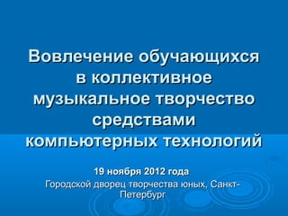 Дворец детского творчества Петроградского района в Санкт-Петербурге, основанный в 1985 году, использует компьютерные технологии для оптимизации образовательного процесса в музыке. Эти методики помогают учащимся осваивать нотную грамоту, ускорять обучение и создавать индивидуальные подборки упражнений. Также технологии вовлекают старших учеников в создание электронных библиотек и помогают во время репетиций оркестра.